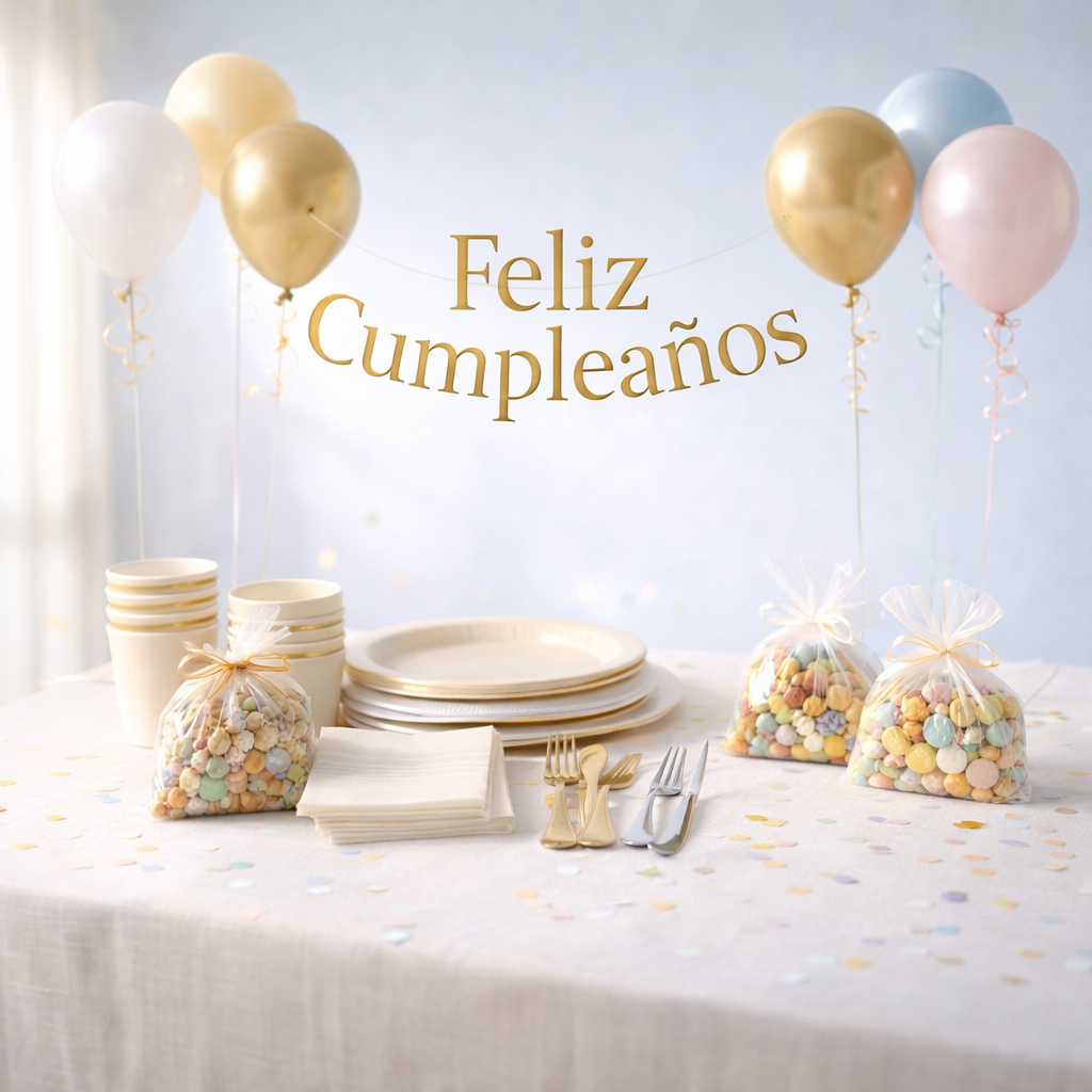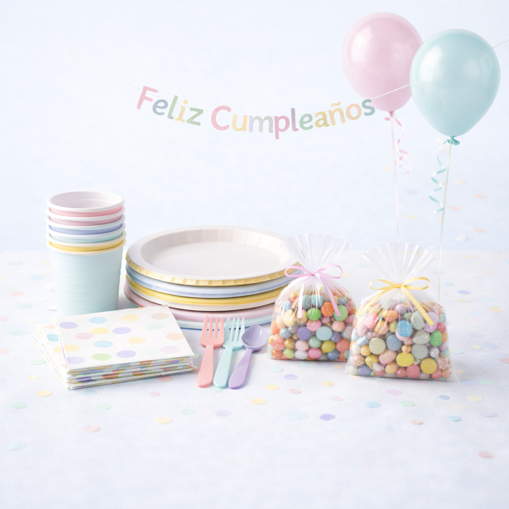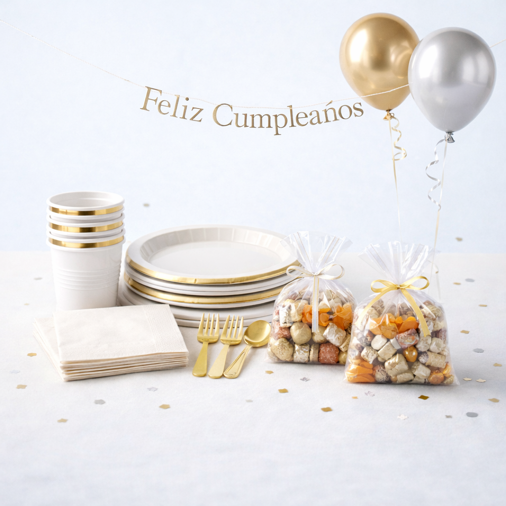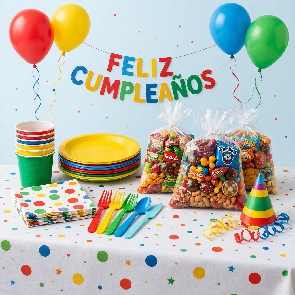 Nuestro kit integra desechables, bolsitas de dulces y un kit básico de decoración, ideal para quienes buscan resolver de manera práctica y eficiente la organización de su evento.